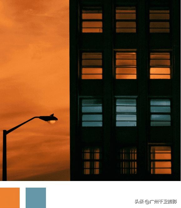 整个画面基本都是暖调的橙色,只有右边的三扇蓝色窗户是冷调的,也是一种对比。