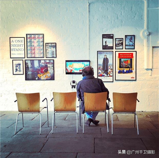 好,首先墙壁上从左到右挂着的画儿有一种节奏感,然后椅子和椅子上的人又形成了一种节奏,两两呼应的感觉。
