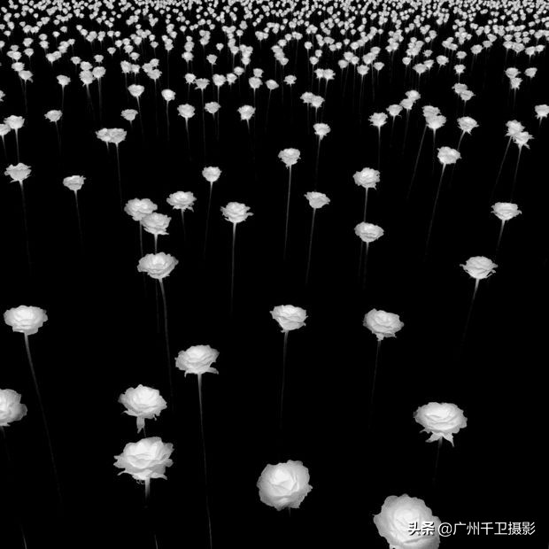 上面这张是一个艺术展览中的装置,展品的作者有意识地运用了重复的美学规律,一朵朵的白色小花,在黑暗中,形成了一片无声的美。