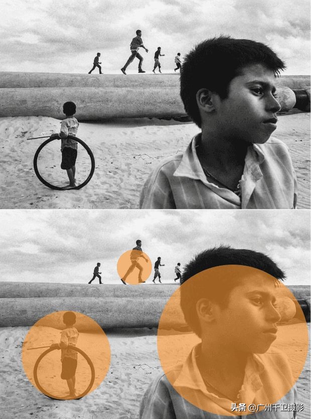 画面左边的滑板少年体积大,离镜头也比较近,而右边的小人儿体积小,但因为离镜头远,拉开了距离,所以整张照片有平衡之美。如果我们把画面右边的小人儿拿掉,整个画面的重心就会非常偏左,视觉上不太舒服。