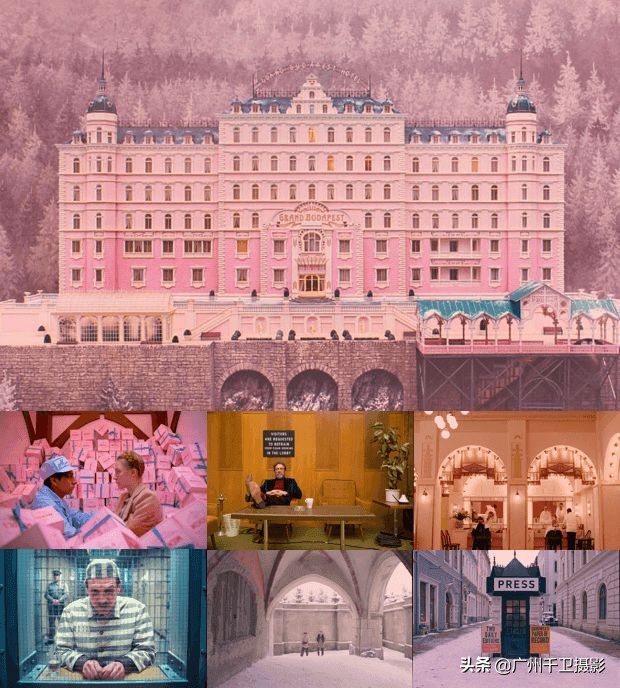 其实,很多出色的电影,也常常用到对比与调和的美学原理。不知道大家有没有看过《布达佩斯大饭店》,这里我截取了一些电影画面,让大家感受其中的色彩的调和与对比之美。